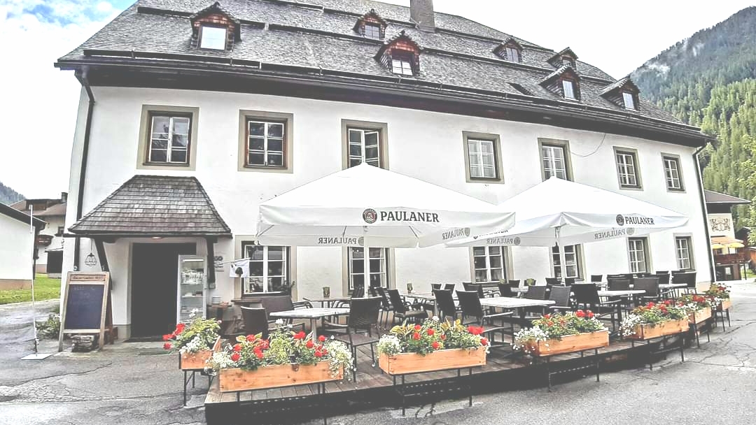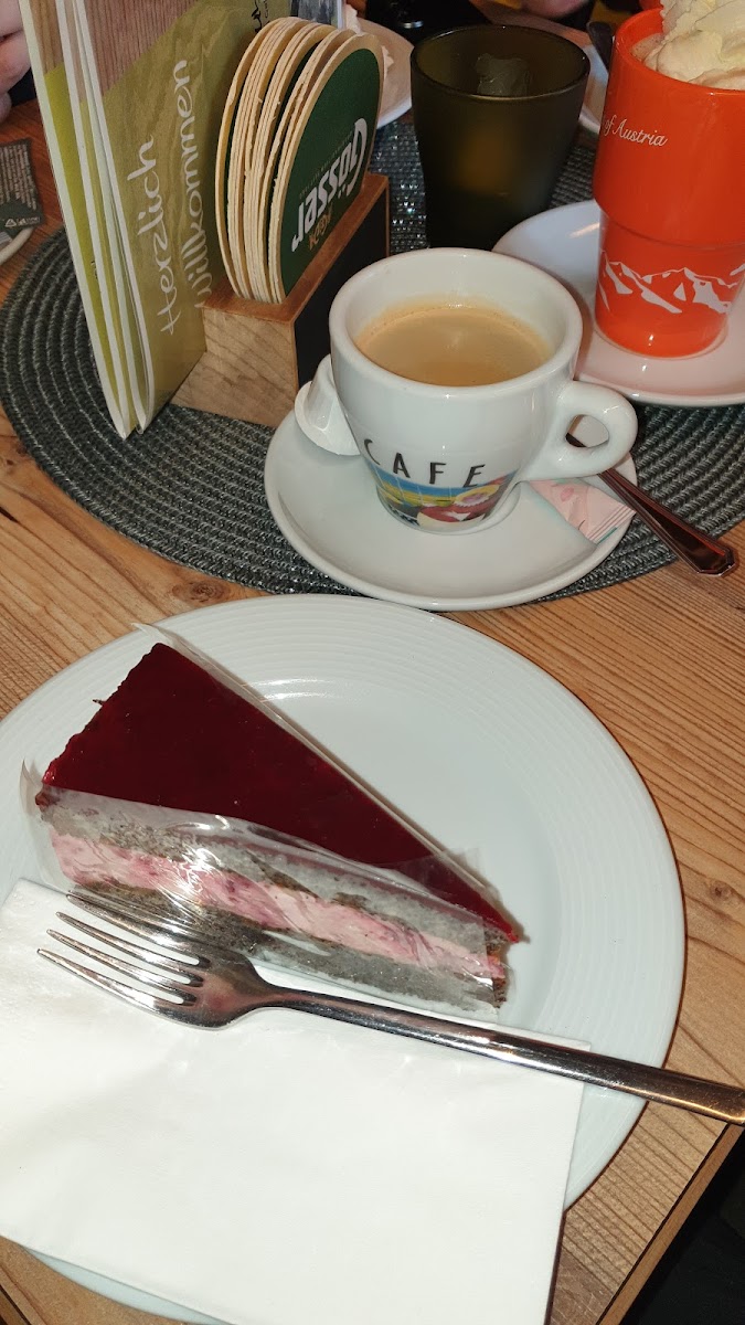 Im Ortszentrum, neben der Kirche gibt es hier eine herrliche Terasse mit Blick auf die umliegenden Bergbauernhöfe und Bergwelt. Der Kaffee ist sehr gut, ebenfalls die selbstgemachte Mehlspeise und alles serviert von einer sehr freundlichen Kellnerin